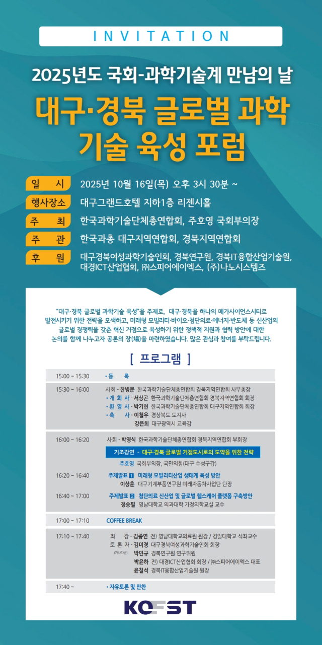 ‘2025년도 국회-과학기술계 만남의 날, 대구·경북 글로벌 과학기술 육성 포럼’이 오는 16일 오후 대구그랜드호텔 리젠시홀에서 열린다.